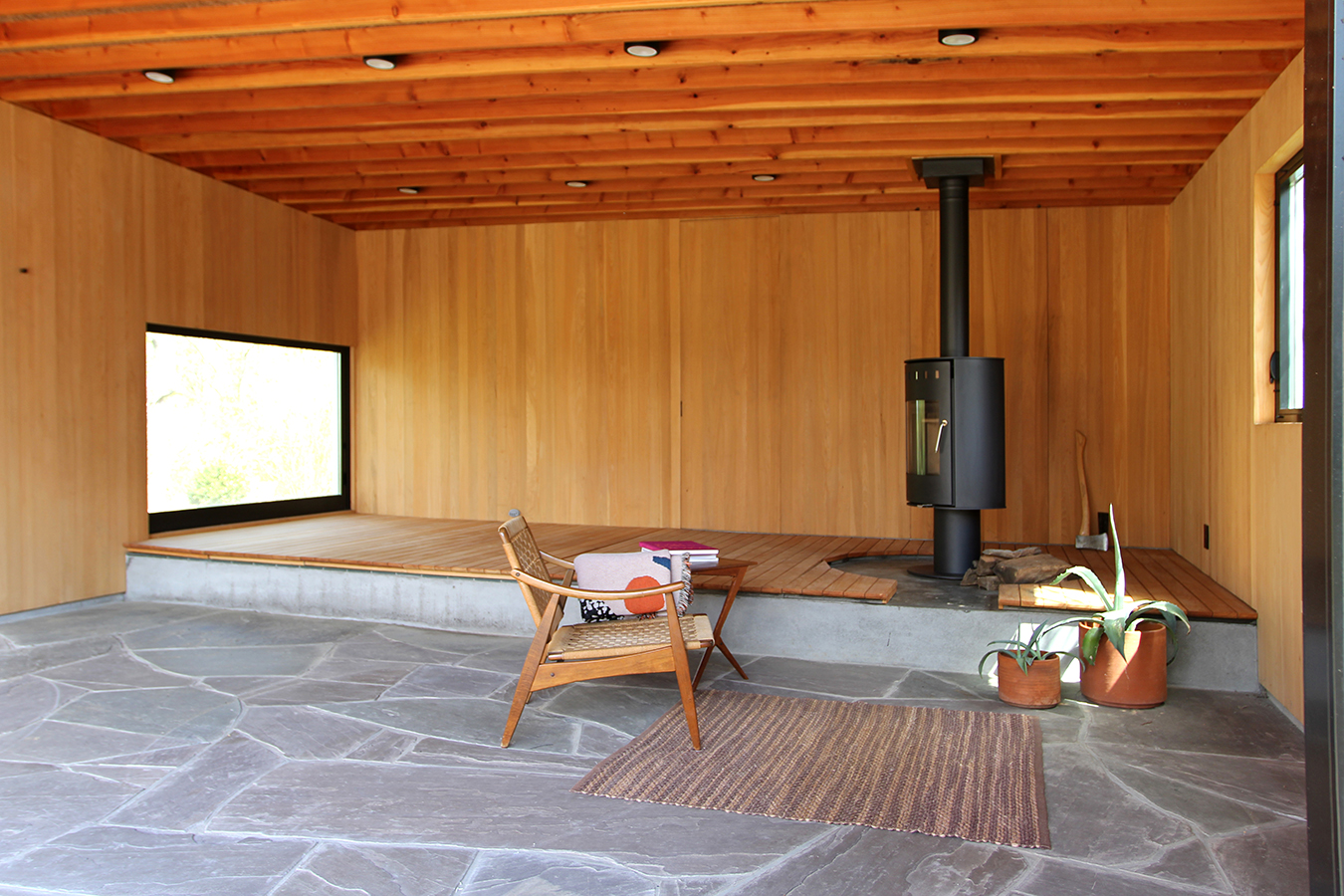 Inside the Scenic Shed an in-ground spa is concealed under removable deck panels which are hooked to the walls when bathing. A wood burning stove provides heat and in warmer weather, doors and windows unfold opening the space to the garden. The exposed rafters in the ceiling express the pitch of the roof and create a subtle undulating canopy. The walls are finished in red cedar and clefted slate pavers cover the floor.